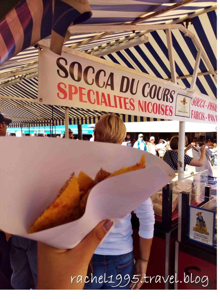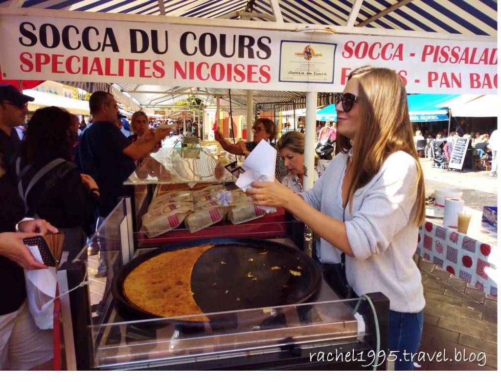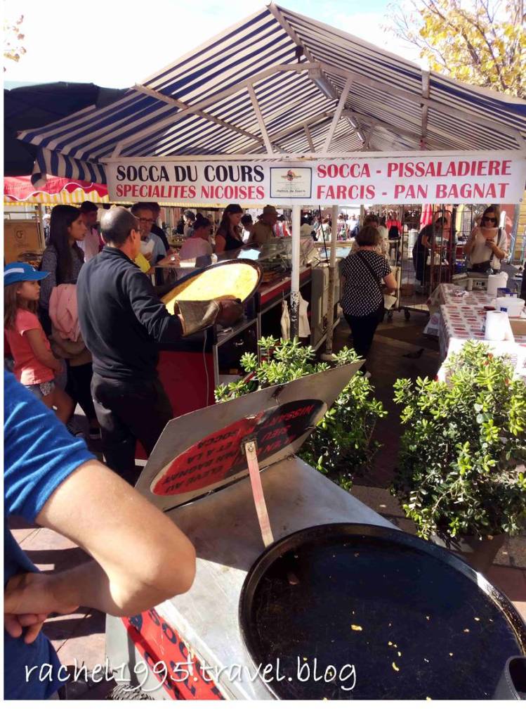 在賽雷亞花果市集裡販賣的銅板美食,鷹嘴豆泥做成的薄餅撒上胡椒粉很唰嘴,因為銷售速度很快,可以看到店家推著推車把剛做好的Socca運到攤販補貨,每個人都可以拿到熱呼呼的Socca, 在這樣熱門的觀光區也只要銅板價 ,必吃!