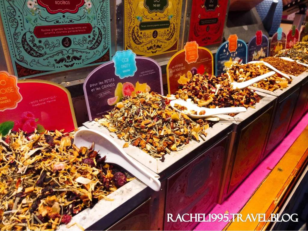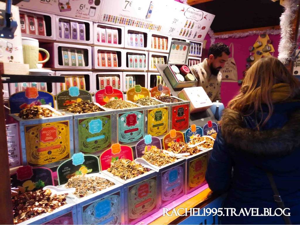 印象中法國的香料茶是聖誕節期間限定,有各式水果、香料味,雖然超市裡就有賣水果味的茶葉,但聖誕市集裡的都會用很漂亮的包裝或是盒子裝,茶葉本身也更華麗,是超市的升級版,送禮超適合。