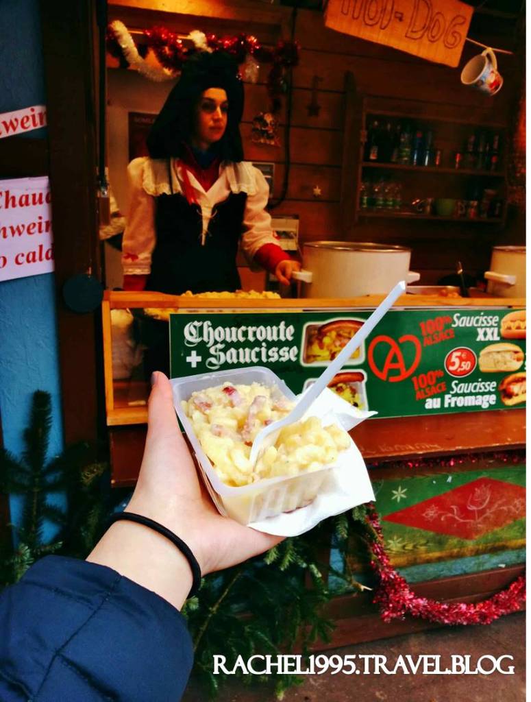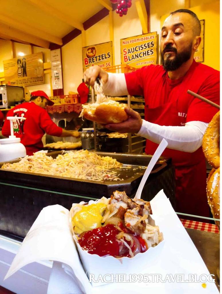 因為史特拉斯堡靠近德國,所以可以見到販賣德式風味餐點的攤販,這位大叔手腳俐落,一下子就遞給我滿出盒子的酸菜、洋蔥跟德式香腸,搭配番茄醬跟黃芥末很開胃。