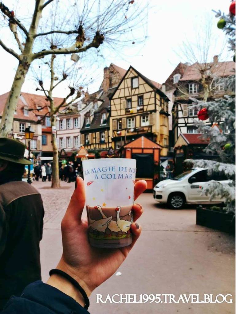 第一次買熱飲的時候需要先付杯子的押金,之後就可以到各個攤販用同個杯子買熱飲,最後可以選擇在任意熱飲攤歸還杯子拿回押金,或是將杯子留著作紀念,科爾瑪的杯子因為很可愛所以我有留下來。